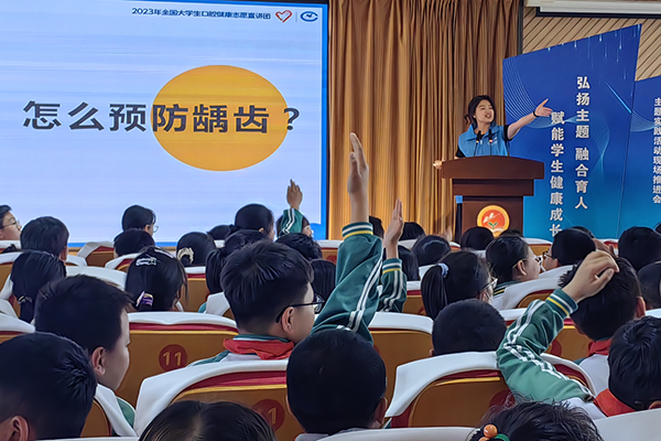 在《龋齿大作战》口腔知识科普宣讲环节,宣讲员宁芸慧通过生动形象的语言,讲解了龋齿形成的原因和预防方法,小学生们认真聆听,并在牙齿模具上操作,在轻松愉快的氛围中明确了口腔健康的重要性,学会了正确的刷牙方法。他们还表示,今后少吃糖、少喝饮料,认真刷牙,自觉抵制口腔不良习惯。