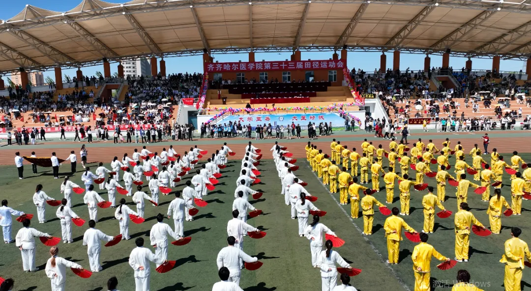 大型团体操表演历来是运动会上最具观赏性的节目之一,今年我院学生团体操带来的是太极拳表演——《乾坤柔劲秀 太极流水韵》,动听的乐曲与明艳的服饰交相辉映。学生们手持太极扇,衣袂飘飘,动作松弛有度、开合有序,展现出了太极扇的优雅与力量,流露中华文化的文雅与深厚底蕴,展现了齐医学子自信从容的精神面貌,构成一幅幅生动的画卷,最终荣获团体操三等奖。