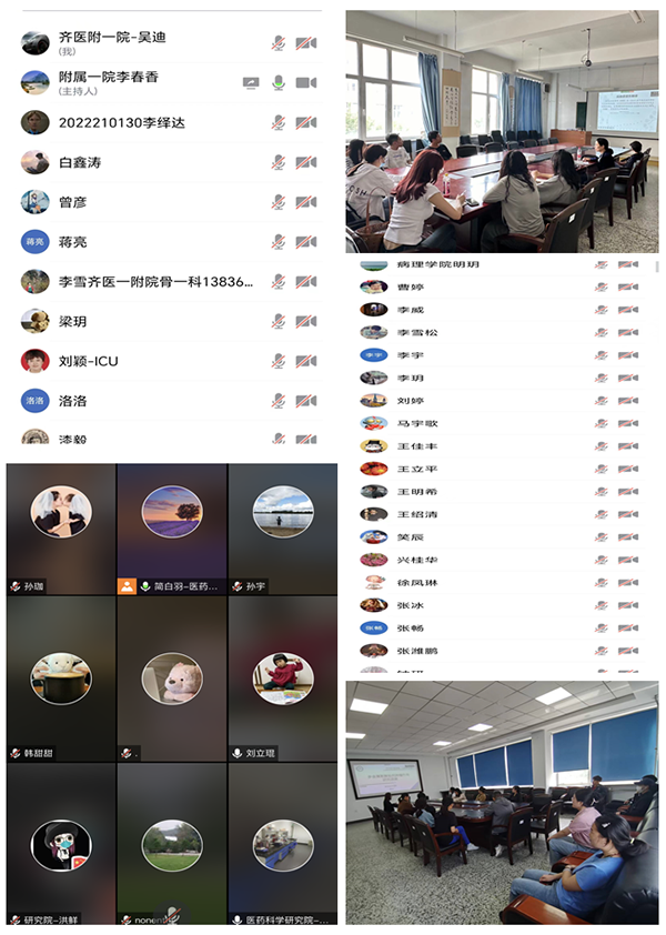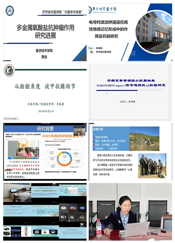 医学技术学院贾迪教授、基础医学院张明龙博士、于增艳博士、公共卫生学院杨晓蕾博士、病理学院张英博博士、医药科学研究院简白羽博士、附属第一医院李春香主任、附属第三医院黄启成副主任,分别以《多金属氧酸盐化合物抗肿瘤作用研究进展》《伏隔核SK通道在病理性情感记忆形成中的研究作用及机制》《不利处境对青少年抑郁问题的影响机制及干预研究进展》《肠道问题在孤独症谱系障碍病因及治疗中的作用》《芒柄花黄紊调控小胶质细胞TLR4/NLRP3/Caspase-1信号通路抗AD机制研究》《岩大戟内酯 B调控脂质代谢重编程抑制胃癌生长》《从检验角度,谈甲状腺结节》《PET-CT 临床应用》为题,从不同的学科研究视角出发进行讲解,引导大家在不同领域的思维碰撞中产生新的理念和方法。