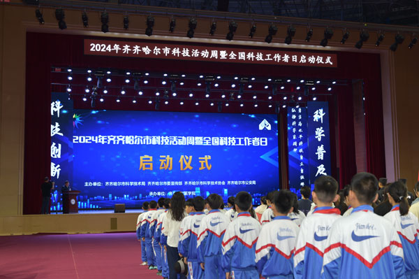 5月28日上午,2024年齐齐哈尔市科技活动周启动仪式在学院体育馆召开。齐齐哈尔市委常委、副市长刘刚,市人大副主任戴晓霞,市政协副主席曲政,学院院长赵光、副院长于海涛出席启动仪式。市直相关单位以及社会各界人士代表200余人参加活动。