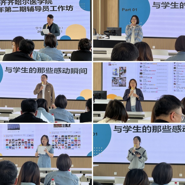 辅导员经验分享环节,基础医学院孙石磊、医学技术学院王慧荣、基础医学院王今、附属第一医院马鑫、附属第二医院陈宇博、附属第三医院姜雪等6位老师分别就学生教育管理服务工作中的感动瞬间进行了分享,气氛温馨感人,引发了现场辅导员的情感共鸣,赢得了阵阵热烈掌声。
