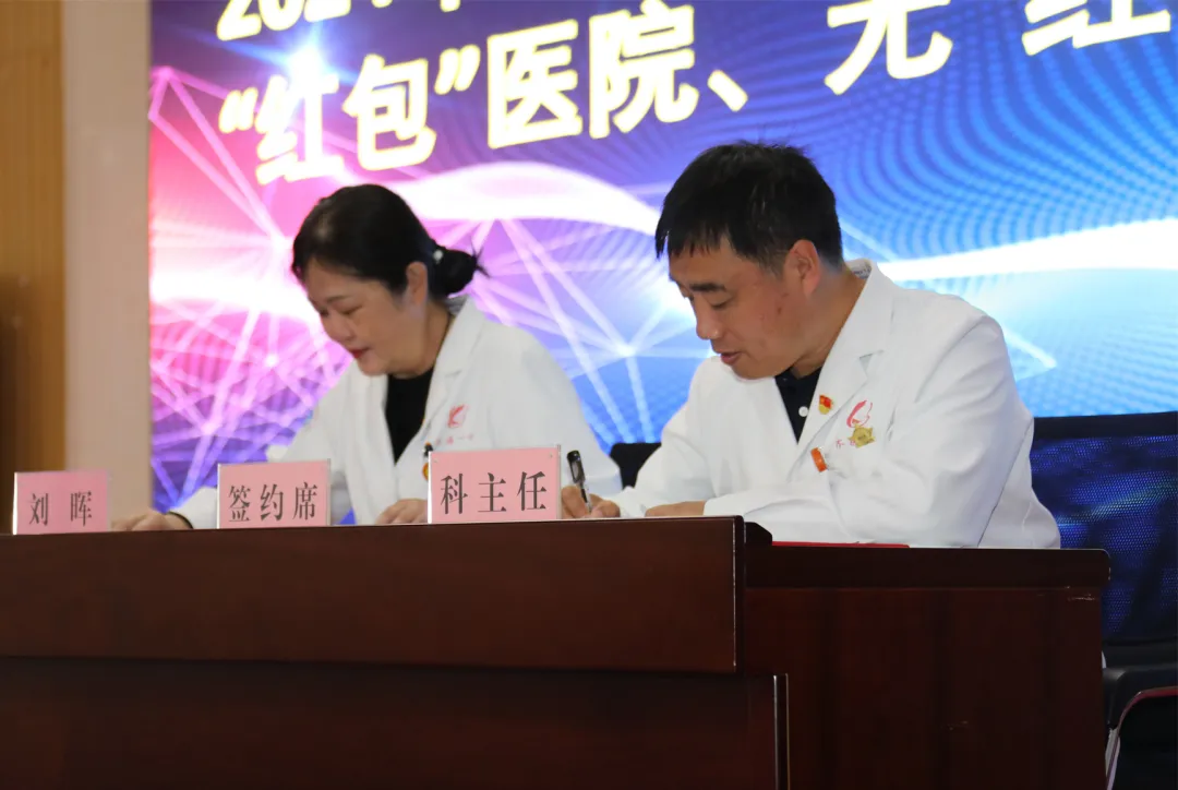 最后,党委书记刘晖代表医院与科主任代表签署了创建无“红包”科室责任状。