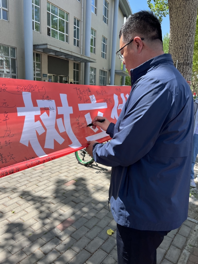 口腔医学院党总支书记姜鹏在宣传条幅签字