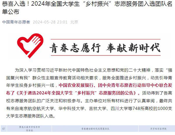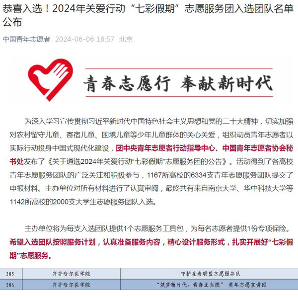 近日,中国青年志愿者协会公布了2024年“七彩假期”志愿服务示范团队和2024年全国大学生“乡村振兴”志愿服务团入选团队名单。在千余所高校近万支青年志愿服务团队中,学院选送的精神卫生学院“守护星者联盟志愿服务队”、病理学院“‘筑梦新时代,青春正当燃’青年志愿宣讲团”成功入选2024年“七彩假期”志愿服务示范团队。学院选送的药学院“青春建功新时代志愿服务队”成功入选2024年全国大学生“乡村振兴”志愿服务团。
