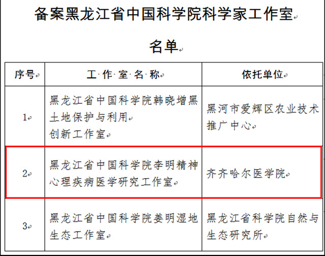 近日,省科技厅公布黑龙江省中国科学院科学家工作室备案名单,学院申报的“黑龙江省中国科学院李明精神心理疾病医学研究工作室”成功获批备案,成为学院首个中国科学院科学家工作室。