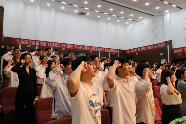 毕业典礼在全体师生齐唱的国歌声中拉开帷幕。随后,全体2024届毕业生重温药学生誓言,辅导员李丹领誓。