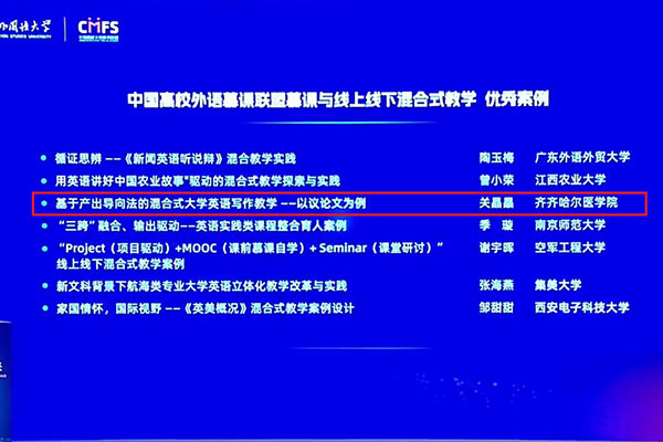 经过9个月的征集与评比,6月15日,由中国高校外语慕课联盟开展的“2023年度慕课与线上线下混合式教学优秀案例征集活动”在北京外国语大学落下帷幕。学院外语教研部关晶晶教授提交的《基于产出导向法的混合式大学英语写作教学——以议论文为例》荣获线上线下混合式教学优秀案例。