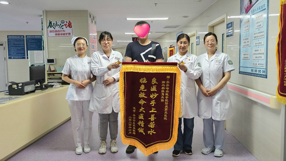 在与患者家属沟通后,患者同意采取多孔腹腔镜技术,急诊手术迅速展开。在患者即将进入手术室接受紧急治疗的关键时刻,患者却发生了失血性休克的紧急状况,通过医务人员的紧急抢救,患者重新恢复了意识,妇二科负责人陈隽一路陪同患者来到手术室。行腹腔镜手术时发现,患者腹腔内积血达到近800毫升。陈隽明确诊断患者为右侧输卵管妊娠破裂。术中,医护人员为患者及时补液,很快,患者苍白的脸上有了血色,血压回升,患者逐渐脱离危险,转危为安。术后患者恢复良好,患者及家属对医护人员的感激之情更是无以言表,在出院前,家属将一面写着“良医妙手上善若水,临危救命大医精诚”的锦旗送到医护人员手中,并感激地说道:“在如此紧急的时刻,医护人员们全力抢救我的爱人,真的十分感谢。”