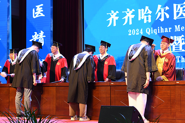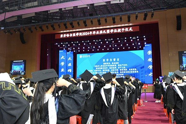 6月19日上午,齐齐哈尔医学院2024年毕业典礼暨学位授予仪式以线上线下相结合的形式举行。学院领导班子成员、学位评定委员会成员、教师和辅导员代表,与1000余名毕业生代表及家长线下参加毕业典礼。2000余名2024届毕业生“云端观礼”,线上观礼人次达2万人次。