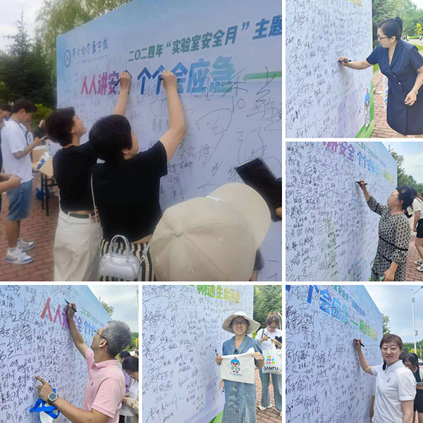 为丰富2024年“实验室安全月”宣传活动形式,进一步强化师生实验室安全意识,规范师生实验行为习惯,6月19日中午,齐齐哈尔医学院2024年“实验室安全月”主题签名活动在春华城学生食堂门前举行。活动以“人人讲安全、个个会应急——畅通生命通道”为主题,学院领导与600余名师生一起参加了签名活动。