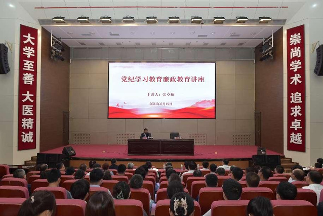为进一步推动党纪学习教育入脑入心、走深走实、见行见效,根据学院党委党纪学习教育工作安排,6月19日,学院党委邀请省委巡视组原组长张卓桥同志来院进行讲座。讲座由学院党委副书记张可勇主持,学院及附属医院全体2700余名党员在主会场或通过腾讯会议方式参加了此次讲座。