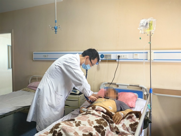 呼吸与危重症医学科一病区副主任牟海军为患者查体