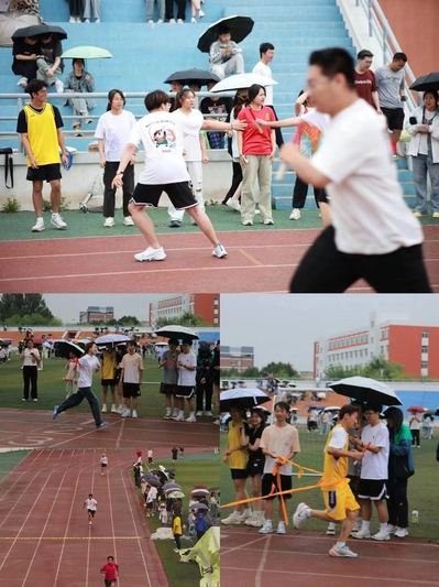 首先开场的是学生干部接力跑,各学院由学生干部组成的5男5女接力跑团队迎着细雨开始了10×100米接力赛,学生干部们如同离弦之箭,在跑道上飞驰而过,将接力棒一次次传递给队友。青春热血与雨水交织,尽显速度与激情,将青春的激情、团队的协作发挥到了极致。