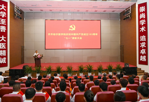 学院党委副书记张可勇、党委副书记迟沫涵,副院长、党委常委史耀忠,纪委书记、党委常委、省监委驻齐齐哈尔医学院监察专员、二级高级监察官李龙珠,副院长、党委常委于海涛分别为受表彰的先进基层党组织、优秀共产党员、优秀党务工作者代表颁发了奖牌和荣誉证书。