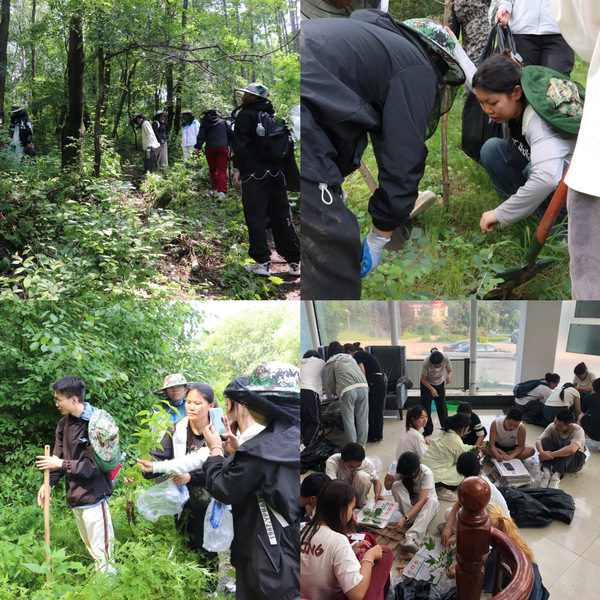 在实践过程中,以组为单位,分为4组,分别由带队教师带领,组长协作下,在草地、山丘和丛林中寻找、辨识各种植物。27日抵达基地,当天15:00各组成员跟随带队教师在基地园区内探寻植物资源,28日、29日全天,依次步行至帽儿山、基地后山开展实践工作。老师细致耐心地讲解沿途植物特征、用途,引导学生判断科的归属,学生们认真聆听,积极回应。各组成员相互配合,完成拍照、采摘、装袋。回到驻地,组内成员共同协作完成标本压制、鉴定等工作。