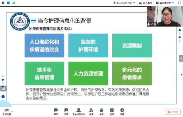 研究生马静以《创新引领 智护未来》为题,介绍了智慧护理在AI、互联网领域的应用和互联网+医疗的实施现状,通过总结护理领域的杰出人才对护理信息化发展的探讨,提出了前沿性发展以及智慧护理未来发展的趋势。许伟岚教授对护理信息化发展的背景、人工智能在护理管理领域的研究现状、目前护理领域的前沿性研究进行了详细阐述,并建议研究生抓住“互联网+”时代为智慧护理赋能的良好机遇,利用科学的技术方法不断探索,使护理工作和管理更加科学化、规范化,以全面推动护理事业的高效发展。