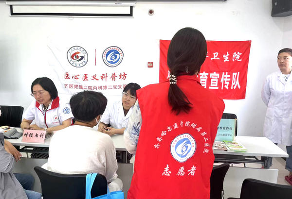 为庆祝中国共产党成立103周年,7月2日,齐医附属二院医合办组织全科医学科、神经内科、临床药学、保健科、团委等科室专家联合北华街道社区卫生服务中心前往东方红龙建小区龙建社区开展“庆七一”义诊志愿服务活动。