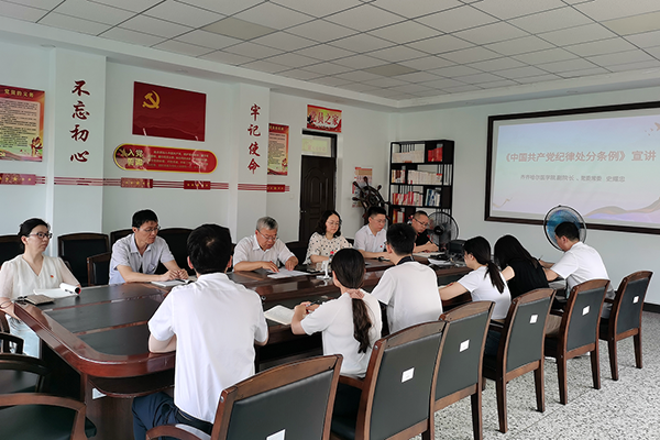 为不断深化党员干部对《中国共产党纪律处分条例》(以下简称《条例》)的理解运用,按照学院党委统一安排,7月5日上午,学院副院长、党委常委史耀忠以《严明六项纪律 坚守底线自觉》为题,深入联系党支部开展《条例》宣讲,引导党员干部学纪、知纪、明纪、守纪。其分管部门学院办公室、后勤管理处、保卫处党员干部线上参加学习。