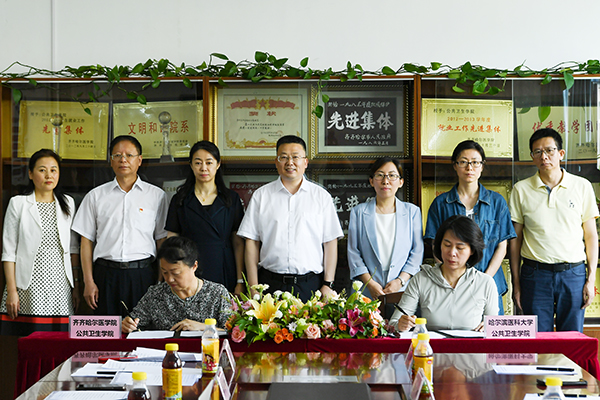 7月4日,哈尔滨医科大学公共卫生学院-齐齐哈尔医学院公共卫生学院战略合作框架协议签约仪式在学院举行,开启了两校携手合作新里程。学校副校长于海涛、科研处副处长岳丽玲、研究生处副处长卢长方、教务处副处长钱丽丽,哈尔滨医科大学公共卫生学院院长李颖、副院长王帆,学校公共卫生学院党总支书记史孝志、院长祁艳波、党总支副书记薛海峰等出席签约仪式。签约仪式由学校公共卫生学院副院长白丽主持。