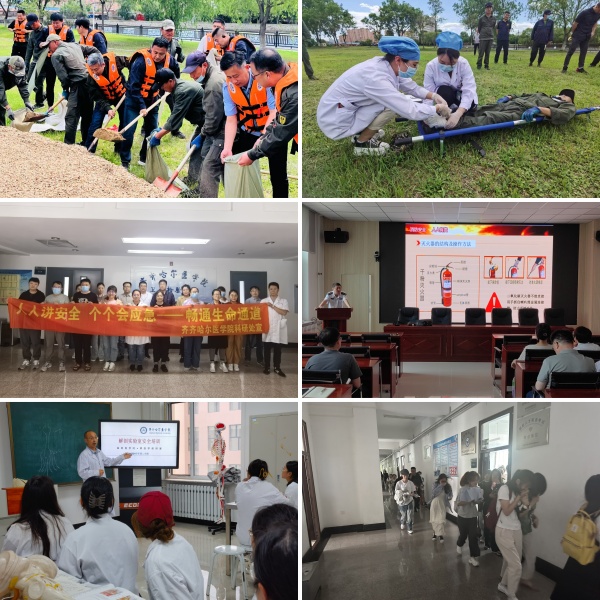 为保障活动顺利开展,学院成立了活动领导小组,制定了《齐齐哈尔医学院2024年“安全生产月”活动方案》。活动期间,在校园主要位置悬挂了宣传条幅,充分利用校园网、校园广播、电子显示屏、宣传展板、微信公众号、QQ群等平台进行宣传。各单位、部门持续深入学习贯彻习近平总书记关于安全生产特别是安全红线的重要论述,通过组织开展安全生产“公开课”“大家谈”“班组会”、观看警示教育视频等多种活动,牢固树立广大师生的安全红线意识。同时,学院聚焦“畅通生命通道”主要内容,在火灾疏散逃生演练活动的基础上,联合属地部门组织开展了模拟火灾和地震等场景的应急疏散演练、线上避险逃生公开课、避险逃生知识竞答等活动,突出生命通道在避险逃生和应急救援中的关键作用,树牢师生不占用、不堵塞安全通道的意识,增强师生避险能力。此外,结合“6.16安全宣传咨询日”,各单位、部门充分利用宣传媒体播放“安全生产月”活动宣传片和公益广告,围绕“人人讲安全、个个会应急——畅通生命通道”活动主题,举行安全倡议、安全宣誓等活动,并组织消防管理人员和志愿者深入校园内食堂、商服等外包服务重点单位开展“入户提醒”“上门宣传”活动,面对面宣传讲解安全防范常识,提升了校内服务人员的安全意识和应急处置能力。