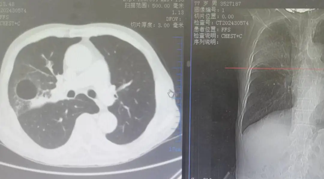 77岁张大爷,咳嗽、咳痰有4个多月了,期间口服药物治疗及静脉输液治疗均未见好转,同时伴随出现发热症状,活动后出现明显喘息症状,因此来我院呼吸肿瘤内科就诊。经肺部CT检查提示,右肺上叶占位性病变伴炎症,左肺下叶肺段切除术后。肺气肿,右肺中叶肺大泡。