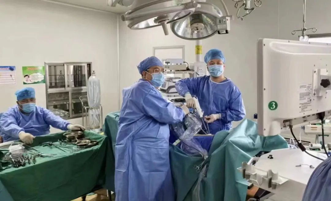 患者胸部CT示患者左肺多处肺大泡病损组织,胸腔广泛粘连,其中1处成串肺大泡与人体最粗的主动脉严重粘连且范围较广,稍有不慎可能造成大出血,手术风险高且难度较大。在排除手术禁忌症后,经过充分的术前讨论,最后决定采用国内最先进的单孔胸腔镜技术进行手术。由王天舒副主任主刀,与信国玺主任、李鑫医生、麻醉科孙志勇医生密切配合下顺利完成手术。手术切口仅为3cm,术中采用了电凝及钝性游离,腔镜闭合器楔形切除法、环烧法、结扎法及生物胶覆膜固化法多种手术技巧。采用肋间神经阻滞封闭减少术后疼痛及美容缝合(无需拆线),微管引流。