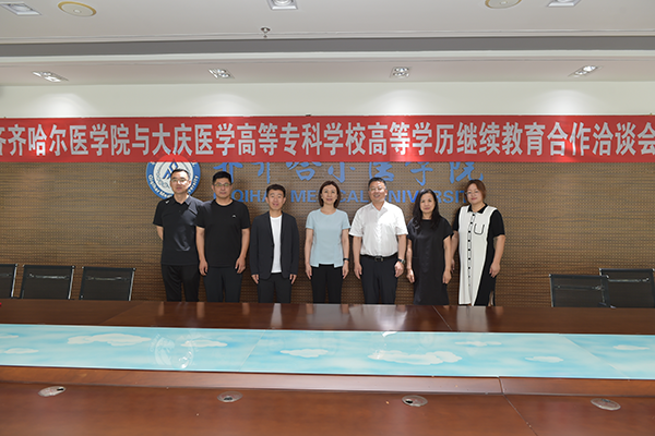7月10日上午,大庆医学高等专科学校副校长马可心、继续教育培训部副主任刘长宇一行来院访问。学校副校长于海涛、全科医学与继续教育学院院长罗庆东、副院长王壮等接待了来访客人一行。双方就高等学历继续教育合作相关事宜进行洽谈,并签订了合作协议。