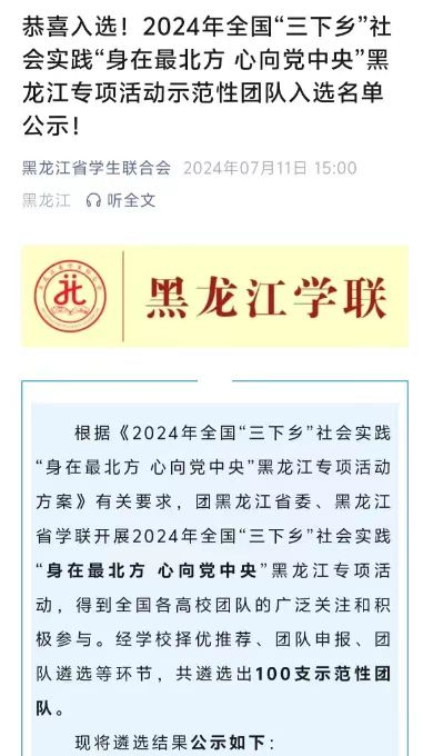 近日,共青团黑龙江省委、黑龙江省学联公布了2024年全国“三下乡”社会实践“身在最北方 心向党中央”黑龙江专项活动示范性团队。学院推报的“电商助农业,宣传助文旅”社会实践团、青春建功新时代志愿服务队成功入选2024年全国“三下乡”社会实践黑龙江专项活动示范性团队。此次活动得到全国各高校团队的广泛关注和积极参与。经学校推荐、团队申报、团队遴选等环节,共遴选出100支示范性团队。