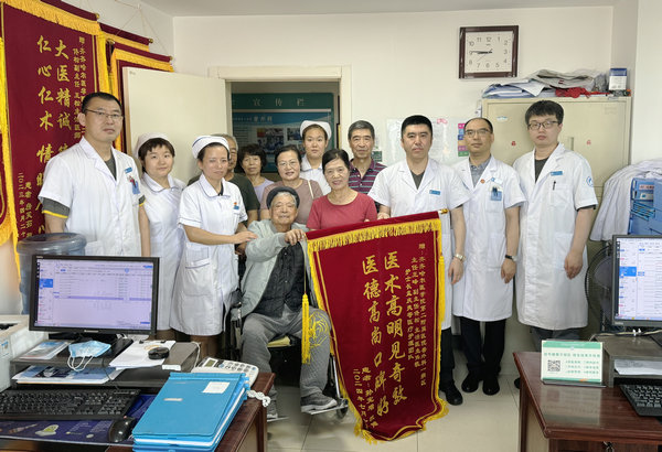 术后恢复要完成加速康复,需要医护团队的密切配合,病人高龄,离床活动困难,在家属和医护的鼓励下,借助专用器械帮助病人尽早离床活动,大大改善心肺状态,显著减少深静脉血栓形成的风险,促进了肠道功能的恢复,团队加重呼吸道管理,使患者顺利度过肺感染高危阶段,精心计算,反复衡量,在保证心脏功能的前提下充分补充液体和能量,加速了病人恢复。为了表达感激之情,孙大爷及其家属为普外科一病区赠送了锦旗,感谢王峰主任及团队的救命之恩!(供稿:普外科一病区 赵春阳 摄像:普外科一病区 王莹 责编:宣传科 吕唱 一审:王峰 二审:高秀文 三审:刘波)