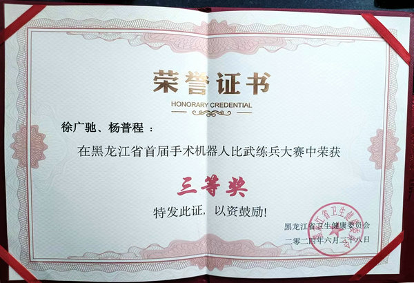 近日,在春意盎然的省城哈尔滨,举办了黑龙江省首届手术机器人比武练兵大赛,来自全省各三甲医院共16支队伍参赛,齐医附属二院泌尿外科一病区徐广驰和杨普程两位医生代表医院参赛喜获三等奖。