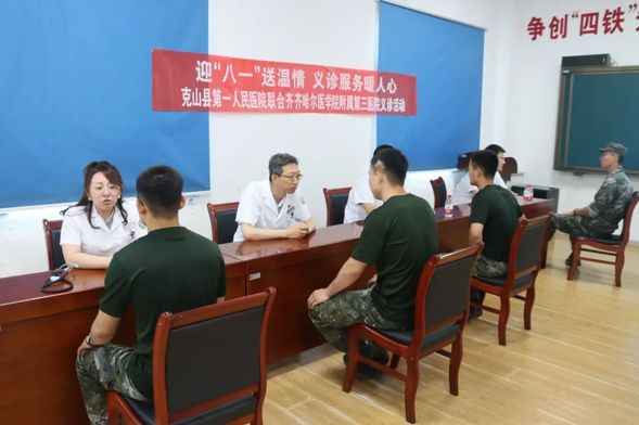 为广泛弘扬拥军优属、拥政爱民的优良传统,营造爱国拥军的浓厚社会氛围,激励现役军人安心服役、建功军营的政治热情,在“八一”建军节来临之际,我院携手克山县人民医院,在克山县武警中队开展“八一送温情,义诊服务暖人心”活动。我院与克山县人民医院共同制定了详细的义诊方案,根据部队官兵们的实际健康需求,选派了来自呼吸与危重症医学科一病区副主任牟海军,老年科主任赵宇,神经内六科副主任任占军,心内三科医生李雪,骨外一科医生杨昊龙,超声科医生李宏等多个科室的资深专家及医护人员组成医疗队,确保为官兵们提供全面、专业的健康服务。