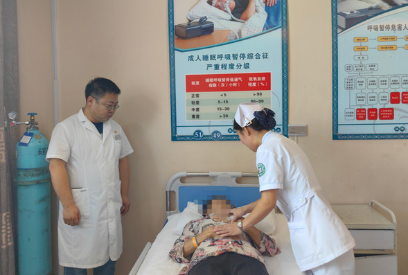 呼吸与危重症医学科三病区主管护师贺宇正在为患有呼吸困难症状的患者进行呼吸康复训练