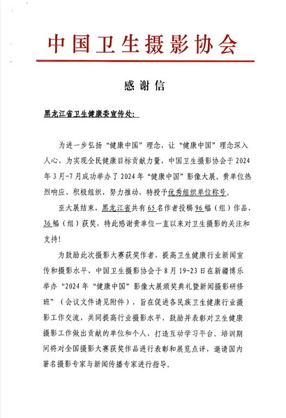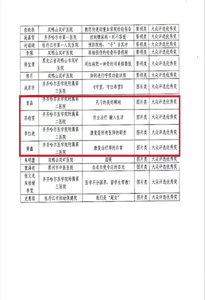 近日,中国卫生摄影协会于2024年3月-7月举办的2024年“健康中国”影像大展圆满落下帷幕,黑龙江省共有65名作者投稿96幅(组)作品,36幅(组)获奖,齐医附属二院积极组织参赛,喜获佳绩。康复医学科袁晶《见习的美好瞬间》、苏晓雪《作业治疗融入生活》、李红艳《康复是所有医师的职责》、黄鑫《康复治疗师的日常》均获得图片类大众评选优秀奖。