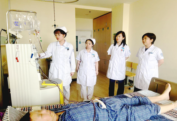 血液移植病房护理组负责人王毓蕾和护士刘雪为患者进行干细胞的采集