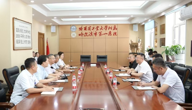 哈尔滨市第一医院高度重视本次调研工作,医院院长闫宏伟带领领导班子及相关部门负责人参加调研座谈。会上,闫宏伟对于海涛一行表示热烈欢迎,并简要介绍了哈尔滨市第一医院的发展历程。医院副院长刘向岩就医院基本情况及即将承担的我院理论教学工作准备情况作了专题汇报,针对教室、宿舍、技能中心等教学条件建设和投入情况,师资队伍建设情况及教学安排等教育教学工作进行了详细汇报。