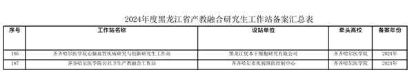近日,从黑龙江省教育厅《关于备案2024年度黑龙江省产教融合研究生工作站的通知》文件中获悉,学院申报的“齐齐哈尔医学院公共卫生产教融合工作站”和“齐齐哈尔医学院心脑血管疾病研究与创新研究生工作站”2个研究生工作站,成功获批2024年度黑龙江省产教融合研究生工作站,予以备案。