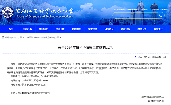 近日,黑龙江省科协发布《关于2024年省科协海智工作站的公示》,学院获批2024年黑龙江省科协海智工作站,是唯一入选设站单位的高等院校。
