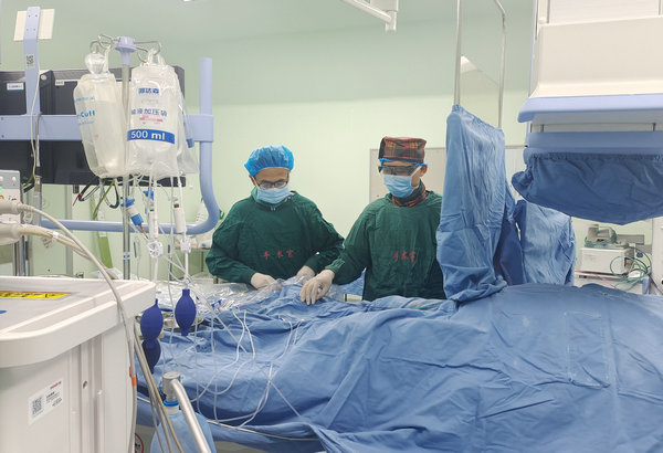 齐医附属二院神经内科四病区主治医师、援疆专家张士存(右一)为患者行取栓手术