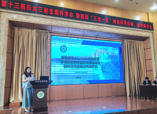 本次会议邀请全国知名专家、优秀青年教师等进行大会报告,充分展示了东北三省及内蒙古自治区生理与神经科学领域的最新教学与科研成果,分享教学经验,活跃学术气氛,提高教学质量,助力了“三省一区”生理与神经科学事业的发展。我院赵宇博士应邀,以《脂肪因子Asprosin调控血管平滑肌细胞表型转化促进动脉粥样硬化进展及机制研究》为题做学术报告,主要从脂肪因子的发现,脂肪外植体的培养及Asprosin对血管平滑肌细胞的影响及在动脉粥样硬化中的作用等方面进行了汇报,并同与会专家进行了深入交流探讨。