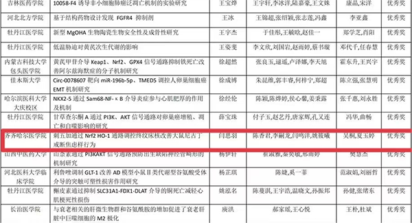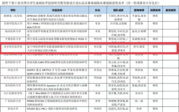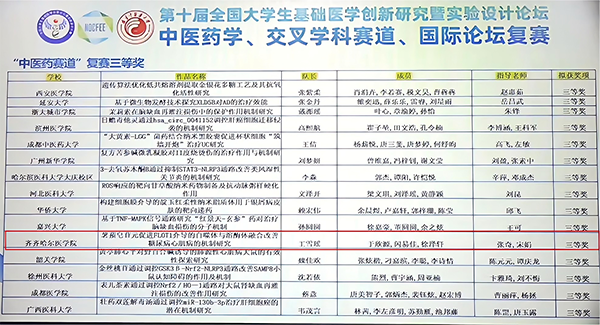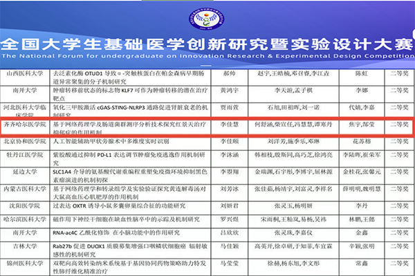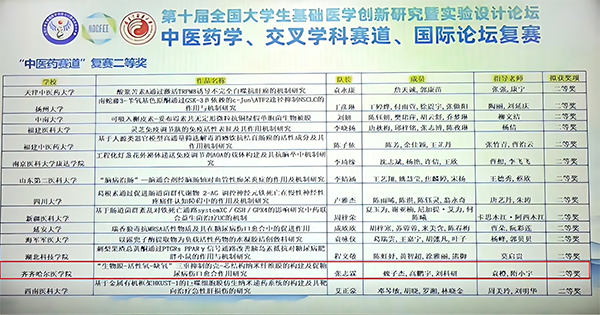 全国大学生基础医学创新研究暨实验设计论坛全国总决赛暨2024“一带一路”国际大学生医学基础研究创新设计论坛由高等学校国家级实验教学示范中心联席会基础医学组主办,中山大学承办,是我国基础医学领域面向大学生的最高水平学科大赛,涵盖中医药学赛道、法医学赛道、交叉学科赛道、口腔医学赛道、预防医学赛道、基础临床赛道,以及2024年新增的“一带一路”国际赛道。大赛以“校赛—分区赛—总决赛”的形式选拔作品,学院药学院2项作品经全国高校校赛选拔,成功进入中医药学赛道分区赛。7月29日,分区赛在福建中医药大学落下帷幕。张奇和宋娟老师指导的项目荣获分区赛三等奖;袁橙和隋小宇老师指导的项目获得分区赛二等奖,并入围全国总决赛。同时,精神卫生学院2项作品成功进入基础临床赛道分区赛。分区赛于6月8日在青岛大学落下帷幕。2023级精神医学专业本科生李佳慧带领的团队(指导老师:焦宇、郜莹)获北部赛区二等奖,2021级精神医学专业本科生闫思羽带领的团队(指导老师:吴桐、夏玉婷)获北部赛区优秀奖。