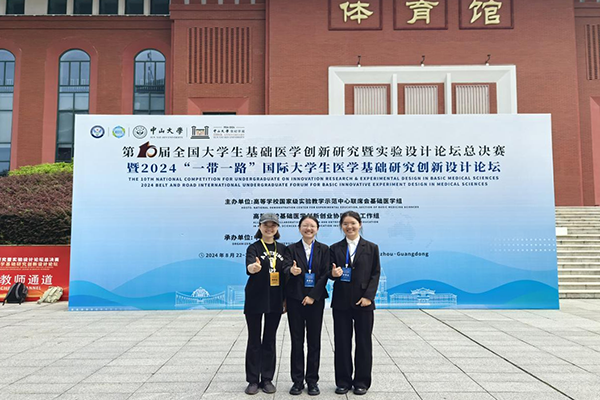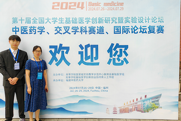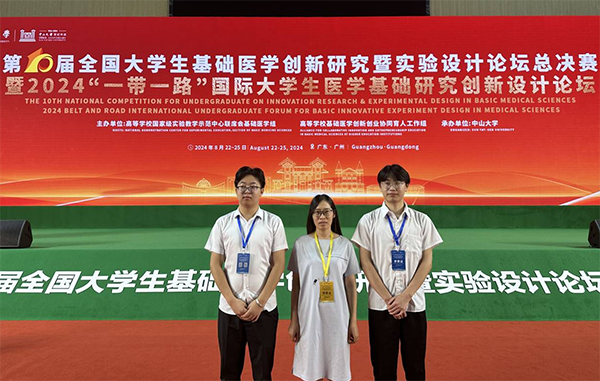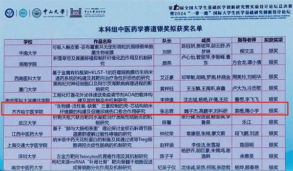 8月23—24日,第十届全国大学生基础医学创新研究暨实验设计论坛全国总决赛暨2024“一带一路”国际大学生医学基础研究创新设计论坛在广州中山大学举行。我校药学院2021级药学专业及制药工程专业本科生张志霖、魏子杰、高鹏宇、刘科研4位同学,在袁橙、隋小宇老师的指导下,凭借《“生物膜-活性氧-缺氧”三重抑制的壳-芯结构纳米纤维膜的构建及促糖尿病伤口愈合作用研究》荣获中医药学赛道银奖;精神卫生学院2023级精神医学专业本科生李佳慧、何舒涵同学,在焦宇老师、郜莹老师的指导下,凭借《基于网络药理学及肠道菌群测序分析技术探究红景天治疗抑郁症的作用机制》荣获基础临床赛道铜奖,这是学院自参与“全国大学生基础医学创新研究暨实验设计论坛”以来取得的最好成绩。