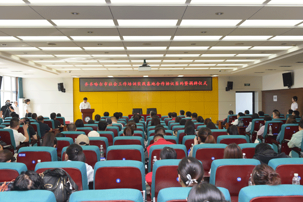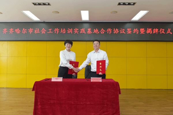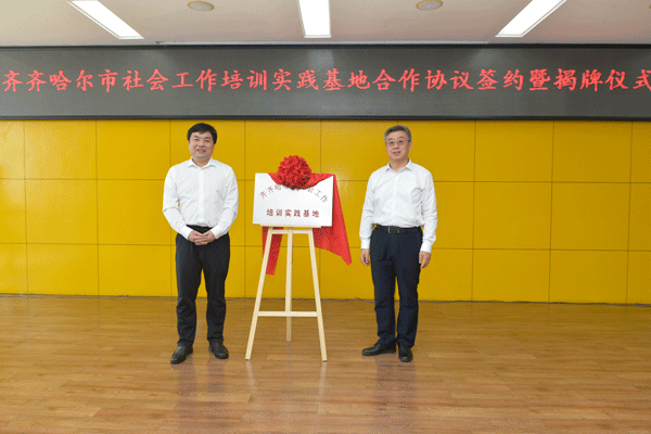 于海涛代表学院与齐齐哈尔市委社会工作部张雪松共同签署“齐齐哈尔市社会工作培训实践基地建设合作框架协议”。赵光、刘振江为“齐齐哈尔市社会工作培训实践基地”揭牌。