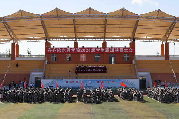 9月1日下午,在雄壮的国歌声中,伴随着五星红旗冉冉升起,学院2024级学生军训动员大会在体育场举行。军训团政委、副院长史耀忠,军训团团长、副院长于海涛,承训部队首长、齐齐哈尔武警支队副支队长曹洪波出席大会。军训团成员单位负责人、军训教官、2024级全体本科学生和辅导员参加了动员大会。大会由军训团参谋长、武装部部长孙立强主持。