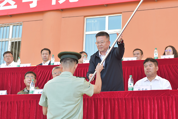 动员大会上,军训团副参谋长、武装部副部长王天翔宣读了2024级学生军训团编制序列。于海涛为军训团授旗。