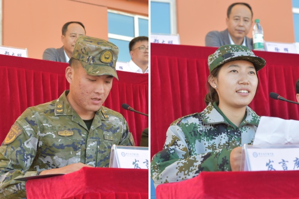 军训教官代表、一营一连连长、二级上士陈彬代表全体军训教官作表态发言,表示将以身作则,认真施教,凭借良好的军人形象及过硬的军事本领带领学生进行军事训练,培养学生雷厉风行的军人作风和高尚的道德情操。参训学生代表、医学技术学院2024级医学影像学专业1班董笑君同学代表全体参训学生庄严承诺,将服从命令、听从指挥,刻苦训练、磨炼意志,团结协作、共同进步,珍惜机会、感恩前行,以积极的态度和顽强的毅力投身军训,上好大学第一课。