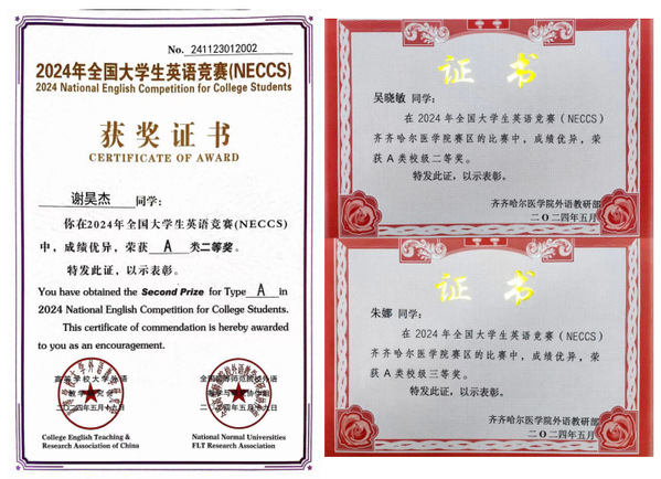 近日,2024年全国大学生英语竞赛成绩揭晓,护理学院2023级研究生谢昊杰荣获研究生A类全国二等奖,吴晓敏荣获A类校级二等奖,朱娜荣获A类校级三等奖。