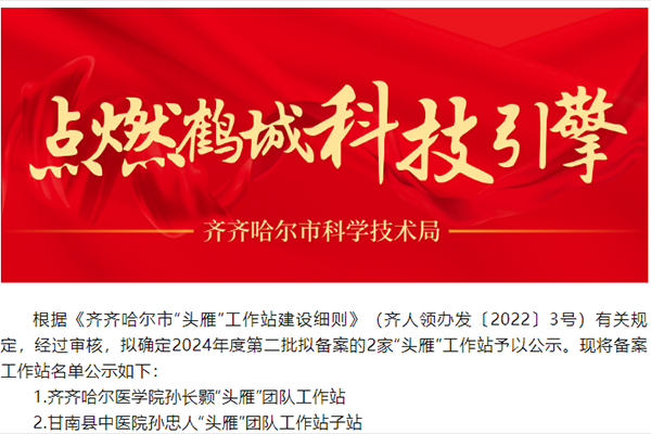 近日,齐齐哈尔市科技局公布了“2024年度第二批齐齐哈尔市拟备案‘头雁’工作站”名单,学院申报的“齐齐哈尔医学院孙长颢‘头雁’团队工作站”喜获备案,成为学院首个“头雁”团队工作站。