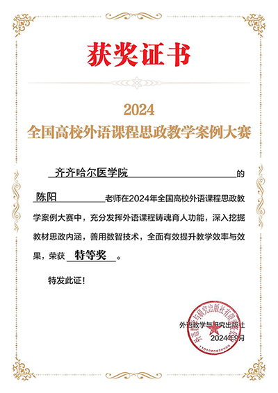 外语教研部在学院领导的大力支持,以及教务处、马克思主义学院的积极配合下,通过举办教学研讨、观摩、竞赛和经验分享等活动,不断提升教师的教学能力和综合素养,推动课程思政内涵式发展。本次荣誉的获得,是学院课程思政建设成果的一个缩影,是“以赛促教、以赛促改”理念的具体实践,也是齐齐哈尔医学院“全员全过程全方位育人”大格局的生动展现。
