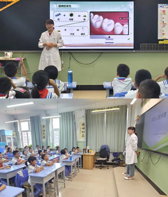 教室内,我院口腔科杨慧医生为同学们进行了一场“小学生口腔保健”健康知识讲座,旨在普及口腔健康知识,提升小学生们的口腔保健意识。杨慧医生通过图文并茂的PPT和动画视频,通俗易懂地向小朋友们揭示了牙齿的构造、功能以及口腔疾病的形成原因和预防方式。活动现场气氛热烈,互动频繁,小朋友们在轻松愉快的氛围中收获了实用的护牙知识。