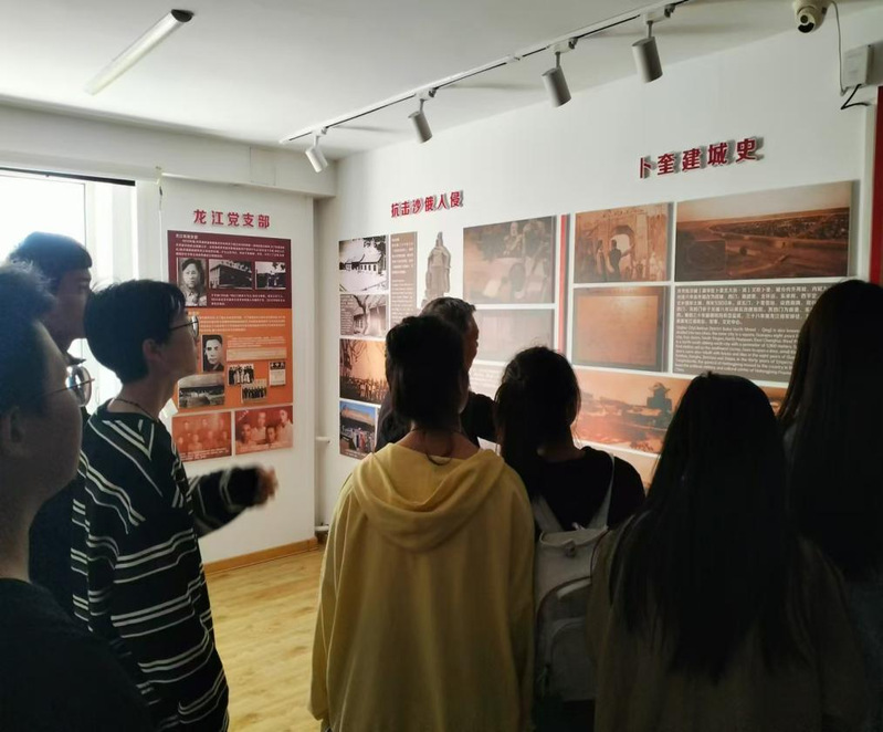 在社区党群活动中心,学生边参观,边聆听社区老党员的讲解,卜奎建城史、抗击沙俄入侵、龙江党支部、江桥抗战、解放门的由来、支援解放战争、抗美援朝、开展社会主义建设等一个个板块,让学生了解了鹤城的悠远历史、为了民族独立国家富强在中国共产党领导下鹤城人民的奋斗史、尤其是为了反击日本侵略的英勇斗争史。
